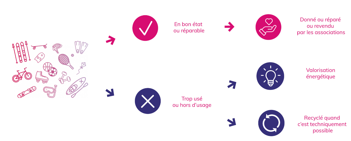 Les articles de sport et de loisirs sont pris en charge par l’éco-organisme à but non lucratif ECOLOGIC. Les articles collectés dans cette filière sont les suivants :